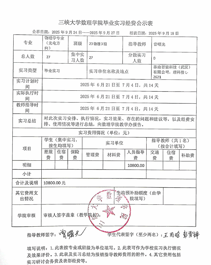 数理学院2025年数学与应用数学专业毕业实习经费公示